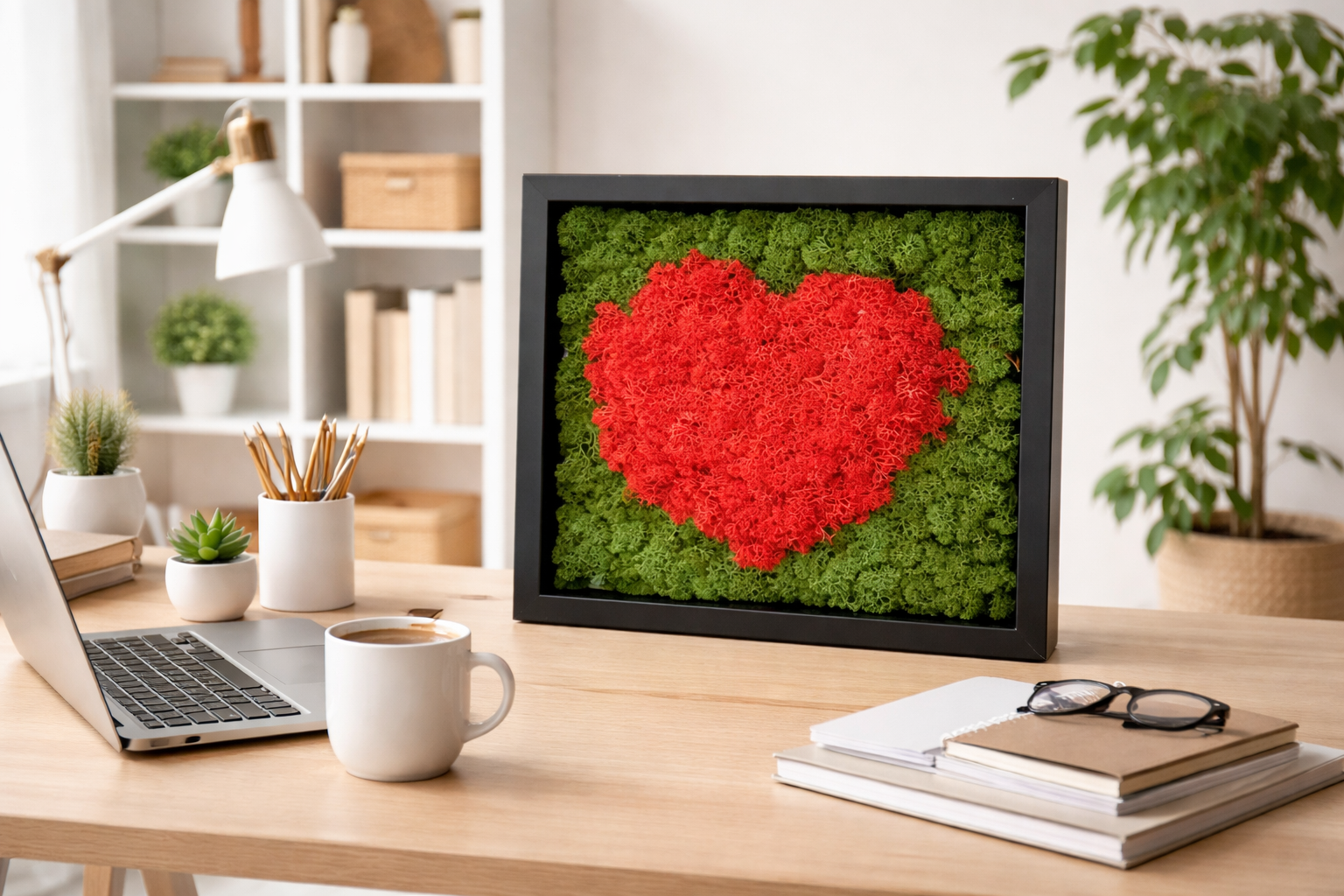 Dieses liebevoll gestaltete Moosbild mit Herzmotiv verbindet natürliche Materialien mit modernem Design. Das leuchtend rote Herz aus konserviertem Moos hebt sich kraftvoll vom satten Grün des Hintergrunds ab und setzt einen stilvollen Akzent auf dem Schreibtisch, Sideboard oder Regal. Ideal für helle, moderne Arbeitszimmer, Wohnräume oder als besonderes Geschenk mit Bedeutung.